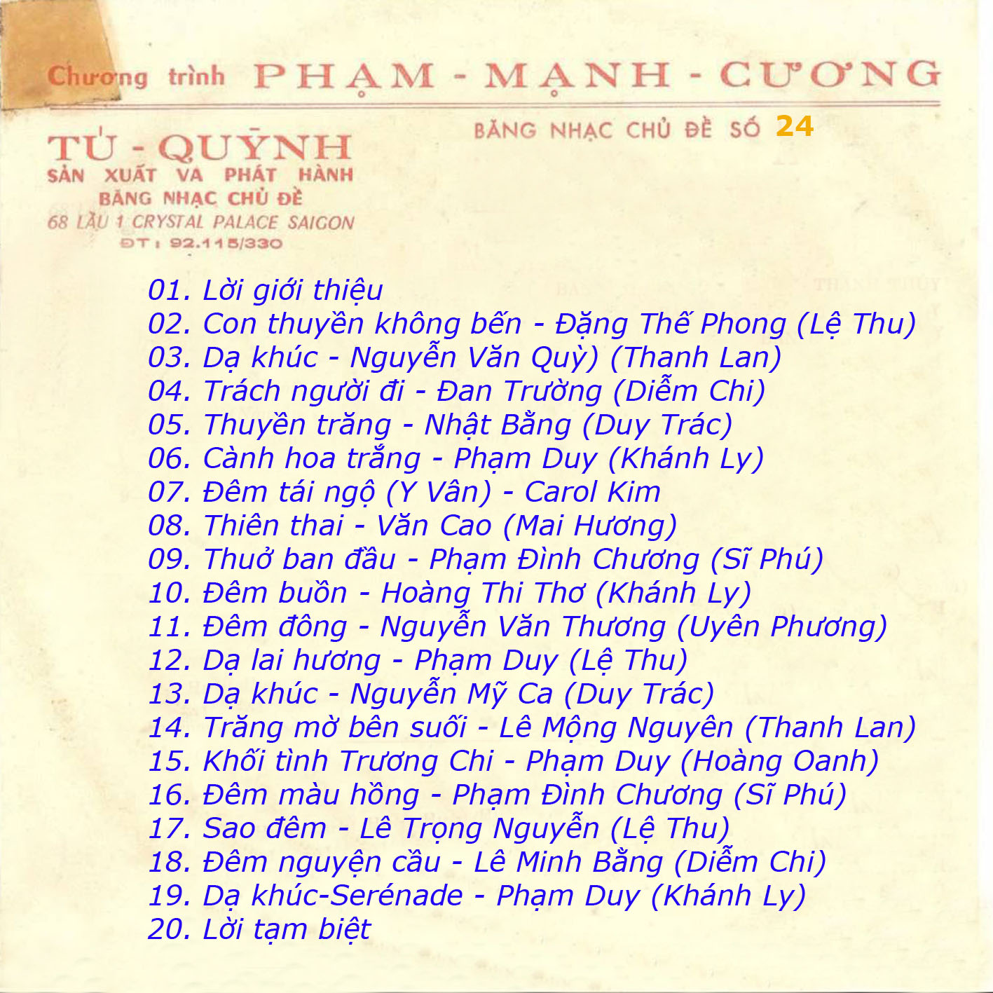 Tất cả những hình ảnh đăng tải trên được Blog và các thân hữu tìm kiếm từ báo cũ, các diễn đàn, trang – hội nhóm sưu tập, mua bán băng dĩa v.v…qua thời gian dài do những người sở hữu chúng hảo tâm chia sẻ công khai. Những tập tin mp3 có thể nghe được trên Blog được nhúng từ các kênh Official Youtube và thuộc về những cá nhân, tổ chức sở hữu chúng. Blog không sở hữu bất kỳ hình ảnh và tập tin âm thanh nào tại đây.